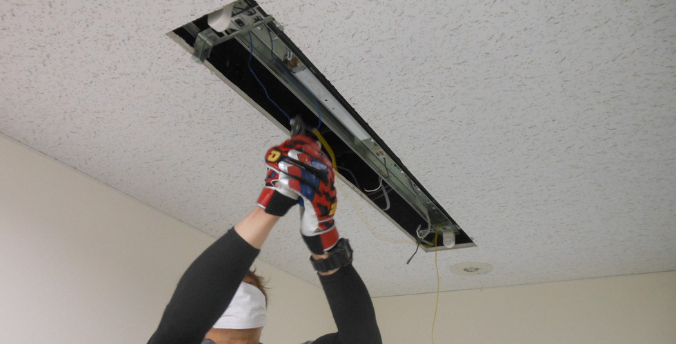 避難口誘導灯の器具交換と既存蛍光灯の照明器具を再利用しLED直管ランプを取り付けるためのバイパス工事を行っているところです。既存の蛍光灯の照明器具にLED直管ランプを取り付けても点灯しないため既存照明器具内の配線を結線変え(バイパス工事)しなくてはならないのです。